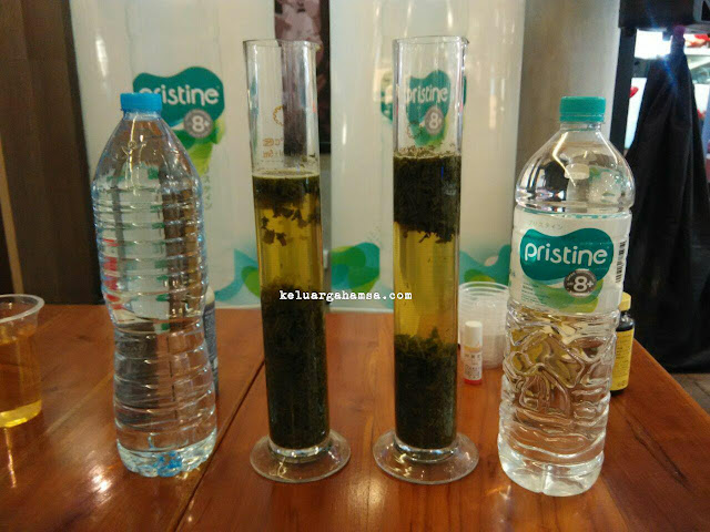 Ketiga, Mr. Kei memasukkan bubuk daun teh ke dalam dua tabung percobaan. Teh dalam tabung pertama kemudian diseduh dengan menggunakan air mineral biasa, sedangkan teh dalam tabung kedua diseduh dengan Pristine 8+.
