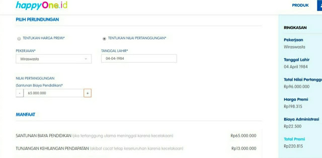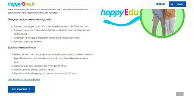Saya kemudian mencari informasi lebih banyak ke website happyOne.id mengenai happyEdu ini. Berdasarkan informasi yang ada di sana, ternyata happyEdu ini memberikan perlindungan utama berupa santunan biaya pendidikan untuk anak apabila saya sebagai orang tua meninggal dunia karena kecelakaan. Trus, kemudahan dari happyEdu ini adalah saya bisa menentukan sendiri biaya pertanggungan atau premi yang saya inginkan.