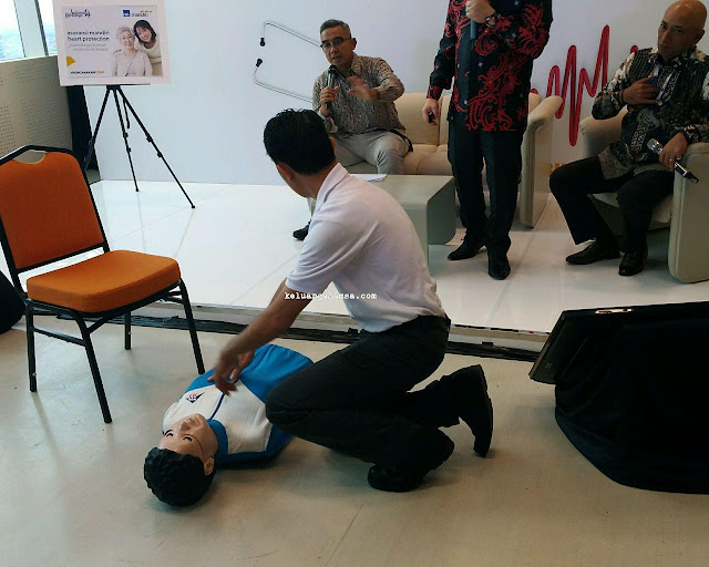 Selain memaparkan mengenai cara mencegah penyakit jantung, dr. Friens Sinaga dibantu dengan salah seorang staf kesehatan juga memperagakan bantuan hidup dasar dan resusitasi korban penyakit jantung. Buat jaga-jaga saat kita bertemu penderita penyakit jantung di tempat umum.