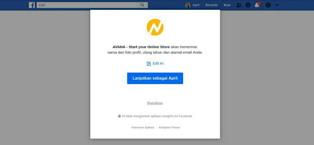 Pertama, kita masuk ke laman AVANA, kemudian lakukan pendaftaran. Kalau sudah ada pilihan pakai platform Facebook untuk login ke store yang sudah kita miliki ya langsung saja pakai itu.