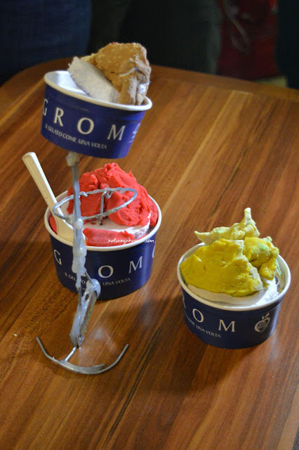 Oh iya, mungkin ada di antara teman-teman yang belum tahu tentang Grom. Grom adalah tempat makan gelato bercita rasa Italia. Dalam Bahasa Italia, gelato itu sebenarnya memiliki arti es krim. Namun, dalam perjalanannya, gelato berkembang menjadi suatu istilah kuliner sendiri. Apalagi, rasa es krim dan gelato itu sangat berbeda.