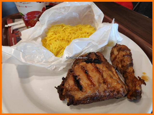 Kalau ayam panggangnya warnanya kecoklatan, namun tidak sampai gosong. Saya dapat dua bagian dada dan paha. Bumbu rempahnya juga nikmat. Daging ayamnya cukup empuk dan tidak terlalu pedas, sehingga anak-anak yang enggak suka pedas masih bisa menikmati. Sementara kalau orang tuanya ingin pedas, kayaknya bisa ambil saus cabe, deh.