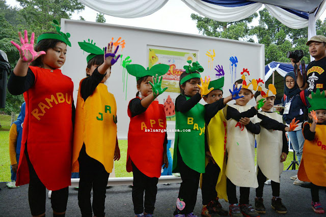 Anak-anak memakai kostum buah-buahan saat pertunjukan panggung di acara Festival Gizi Anak.