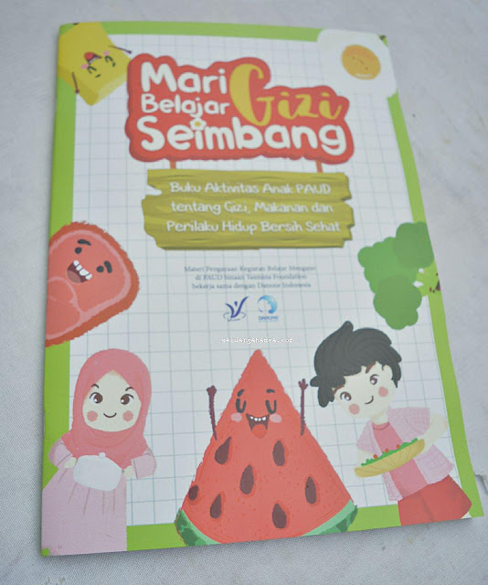 Salah satu langkah edukasi gizi yang dilakukan Danone Indonesia bersama Yasmina Foundation adalah menerbitkan buku edukatif berjudul “Mari Belajar Gizi Seimbang Bersama Piru dan Tumpi”. Buku ini semacam buku aktivitas belajar untuk anak-anak di sekolah-sekolah gitu. Bedanya, buku ini setiap lembarannya bertema gizi, makanan, serta perilaku hidup bersih dan sehat yang patut diajarkan ke anak-anak.
