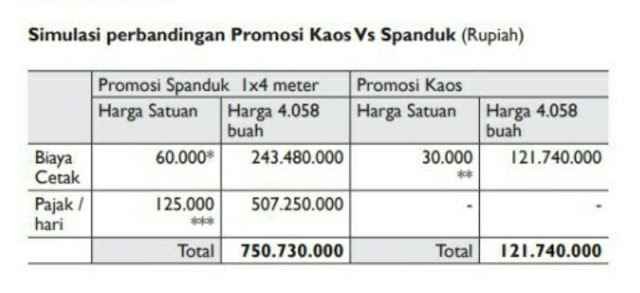 YLA dan pakar advertising kemudian membuat simulasi perbandingan promosi dengan kaus anak dibanding dengan spanduk. Berikut adalah simulasi perhitungannya: