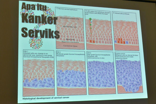 Dr. Ferry kemudian menunjukkan gambar yang menceritakan bagaimana perjalanan pernyakit pada kanker serviks. Dalam gambar tersebut terlihat bentuk serviks yang normal, kemudian mengalami pra-kanker dimana pra-kanker ini terdiri dari lesi derajat rendah yang bisa berubah menjadi lesi derajat tinggi, kemudian bisa berubah lagi jadi karsinoma in situ yang merupakan kondisi serviks sudah terserang kanker.