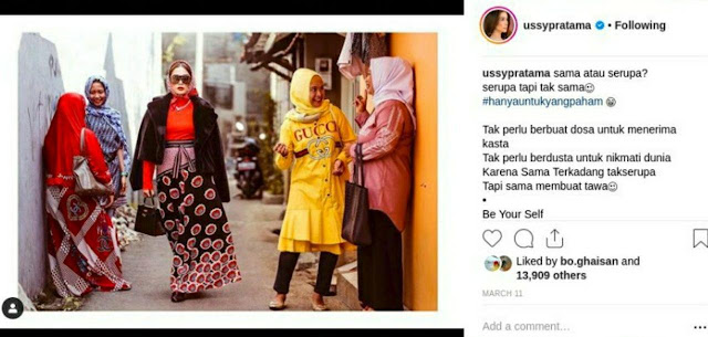 Aku sejak dulu udah kagum sama Ussy, makin kesini makin moncer juga ya. Dia termasuk artis yang punya pemikiran out off the box soal usahanya. Juga terutama foto di IGnya itu, udah penasaran waktu itu. Ternyata yang jalan di gang maksudnya bagus sih. Nggak perlu emang OOTD dengan brand palsu, kelihatan kok kalo bukan asli ya