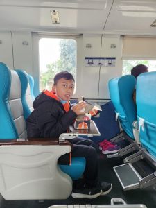 BTW, ada cerita lucu nih, gara-gara kereta-kereta ini ditarik oleh lokomotif yang sama. Jadi, awalnya saya dan keluarga hamper nyasar mau masuk ke gerbong kelas bisnis. Untung mas-mas pramugari ngasi tau kalau gerbong eksekutif letaknya di belakang, sehingga wurung masuk gerbong bisnis.