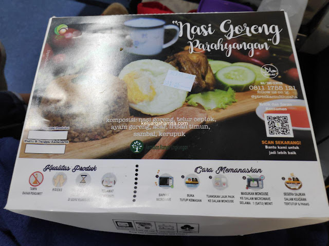 Dalam satu box berisi nasi goreng dengan porsi yang cukup lumayan. Trus, dapat ayam goreng yang cukup gedhe juga, plus telur ceplok, lalapan, krupuk, dan sambel kemasan. Menurut Maxy sih nasi gorengnya keras, hehe. Tapi buat ayam dan telur ceploknya ya lumayan lha.