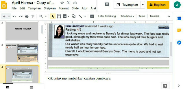 Setelah, bisa memberikan deskripsi suatu produk/ benda, selanjutknya Mrs. Andrea menjelaskan cara menuliskan pendapat/ komentar sesuai pengalaman kita setelah mencoba sesuatu. BTW, Mr. Andrea enggak hanya mengajari cara memberikan pendapat yang bagus-bagus aja, namun juga komentar yang buruk kalau produk yang direview emang kurang bagus. Contoh kalimatnya seperti ini: