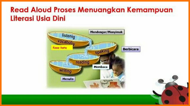 Proses literasi anak memang dimulai dari listening dulu yaa.. Ketika ayah atau ibu membacakan buku secara read aloud, maka anak lama-kelamaan akan memproses apa yang didengarnya sebagai kosa kata baru yang mendukung kecakapan berbicaranya di kemudian hari. Bahkan hingga menunjang kemampuan menulis juga.