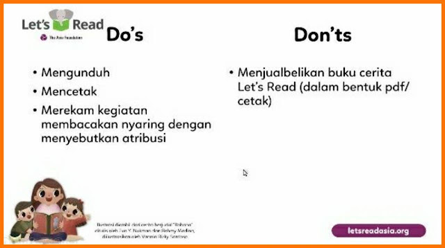 Mbak Elsa juga mengatakan bahwa semua buku koleksi Let’s Read Indonesia boleh diunduh, dicetak, boleh pula kegiatannya direkam asalkan menyebutkan atribusinya. Namun, sangat dilarang untuk diperjualbelikan.