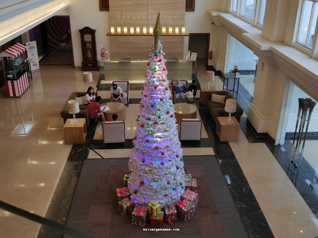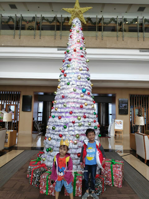 Waktu itu, begitu masuk hotel, ternyata suasana Natal dan pergantian tahun udah sangat terasa. Di lobi depan hotel, persis di depan pintu masuk, terdapat Pohon Natal yang menjulang sekitar 3 meteran. Uniknya, Pohon Natal tersebut bukan Pohon Natal biasa, melainkan Pohon Natal yang terbuat dari susunan kertas bekas dengan dihiasi hiasan warna tembaga, emas, serta merah dan hijau khas Natal. Tak lupa, ada hiasan bintang besar berwarna keemasan di ujung Pohon Natal itu. Kado-kado, juga diletakkan di kaki Pohon Natal, yang membuat anak-anak langsung tertarik ingin tahu apa isinya.