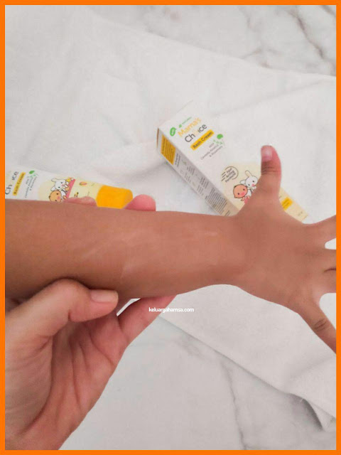 Sedangkan untuk bentuk rash cream-nya lebih seperti krim salep gitu. Teksturnya cukup ringan dan ketika dioleskan ke kulit anak sangat cepat menyerap.