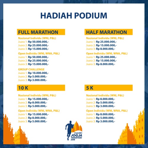 Mandiri Jogja Marathon 2018 diikuti sekitar 8000 peserta, baik dari dalam dan luar negeri. Sebenarnya, enggak heran sih kalau pesertanya banyak, sebab hadiah dari ajang ini sangat menarik. Berikut adalah hadiah-hadiah yang diperebutkan pada Mandiri Jogja Marathon 2018 kemarin: