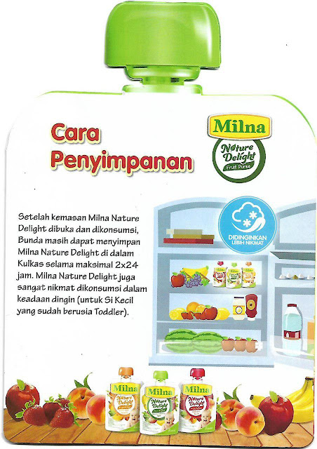 Kemasan Milna Nature Delight berbentuk pouch yang dianggap sebagai cara ideal untuk memberi buah kepada si kecil. Jadi, anak-anak bisa mengkonsumsi langsung dari pouch-nya. Selain itu, kita juga bisa menuangkan isi Milna Nature Delight ke sendok atau ke dalam mangkuk trus disendokin.
