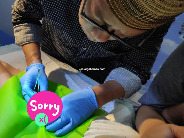 Setelah anaknya udah agak tenang, baru deh mau dibaringkan di bed dan dibuka celananya. Eh, tapi itu juga dia masih agak-agak rewel. Ketika mau dibius juga sempat menolak, akhirnya kami, dokter, dan mas-mas admin tadi megangin dia. Dokter bilang ke Maxy kalau nanti enggak akan terasa pas dipotongnya, jadi enggak usah takut, walau sakit dikit saat dibius.
