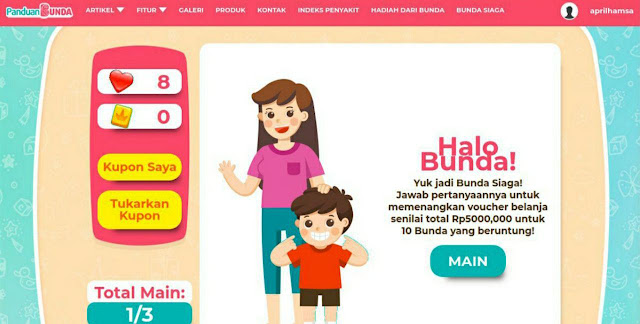 - Kalau bunda bisa menjawab pertanyaan dengan benar, maka akan mendapatkan 1 poin (simbol hati). Nah, tugas bunda adalah mengumpulkan poin ini sebanyak mungkin untuk kemudian ditukar dengan kupon hadiah.