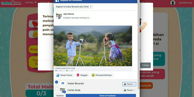 - Kalau bunda membagikan hasil permainan di Facebook, nanti bunda akan dapat tambahan 5 poin.