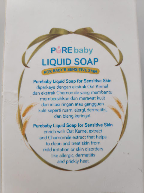 Kemudian, lanjut tentang komposisi Purebaby Liquid Soap, sabun mandi ini terbuat dari ekstrak Oat Kernel, ekstrak Chamomile, dan Pro Vitamin B5 yang pada dasarnya memiliki fungsi merawatk kulit bayi sensitif dari iritasi ringan atau gangguan kulit.