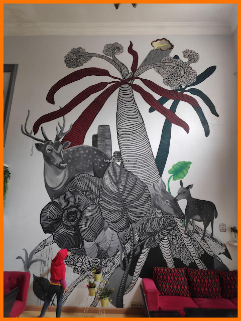 Interiornya cukup bagus. Ada mural atau lukisan di dinding yang gede banget di salah satu sisi dindingnya. Sepertinya gambar hewan-hewan seperti rusa dan pohon-pohon gitu.