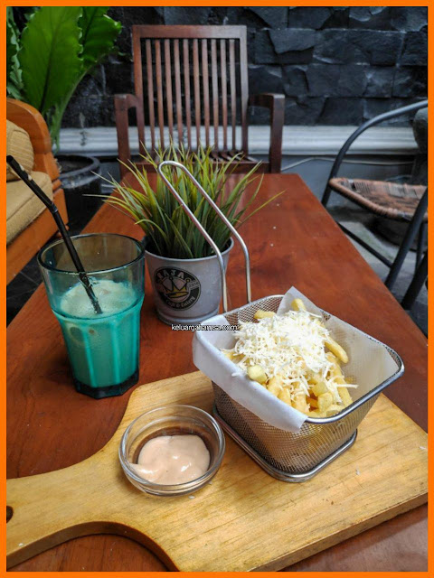Lalu soal french fries-nya, kafe ini enggak pelit memberikan potongan kentang goreng plus topping keju di atasnya. Wadah penyajiannya juga cukup estetik. Rasanya sih ya seperti french fries pada umumnya. Anak-anak saya cukup suka rasanya. Lumayan buat ganjel perut saat nungguin anak sekolah.