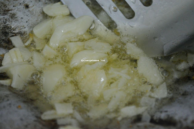 - Panaskan minyak goreng di wajan penggorengan. Setelah wajan panas masukkan bawang putih yang dicincang tadi. Tumis sampai berbau harum.