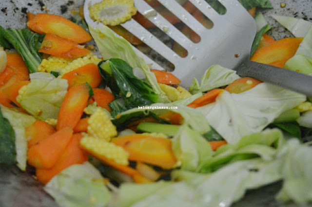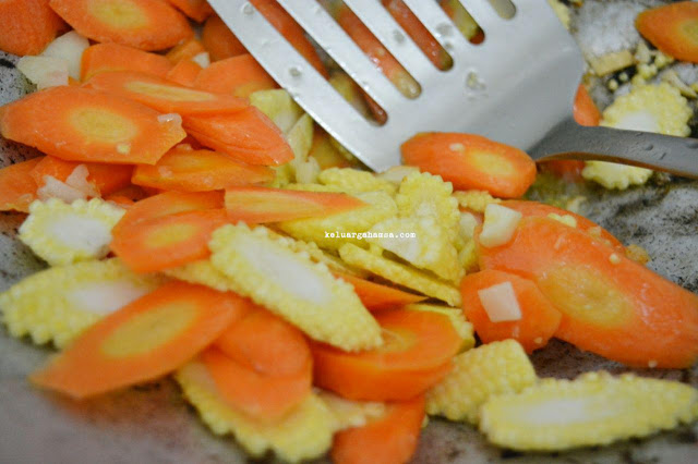 - Masukkan wortel dan baby corn, tumis sampai agak layu.