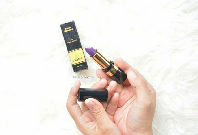 Saya punya Dissy Color Lipstick yang berwarna ungu atau Devina. Saat membaca box-nya katanya sih lipstick ini mengandung grape seed oil. Katanya sih, grape seed oil inilah yang bisa melembabkan bibir kita saat memakai lipstick jenis ini. Emang, bibir terasa lembab dan enggak kering kalau memakai lipstick yang satu ini.