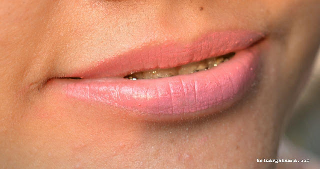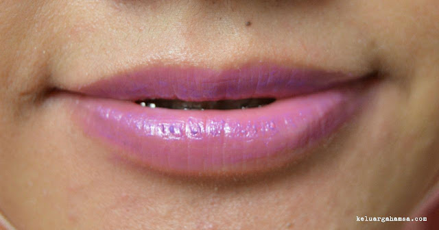 Saat pertama kali melihat warnanya yang ungu, terus terang saya ragu untuk memakainya. Namun, ternyata, kalau dipoleskan ke bibir saya jatuhnya cocok-cocok aja. Hmmm, apa karena saya makainya enggak terlalu tebal ya? Sehingga, warnanya jadi enggak ungu banget, melainkan masih ada nuansa pink-nya gitu?