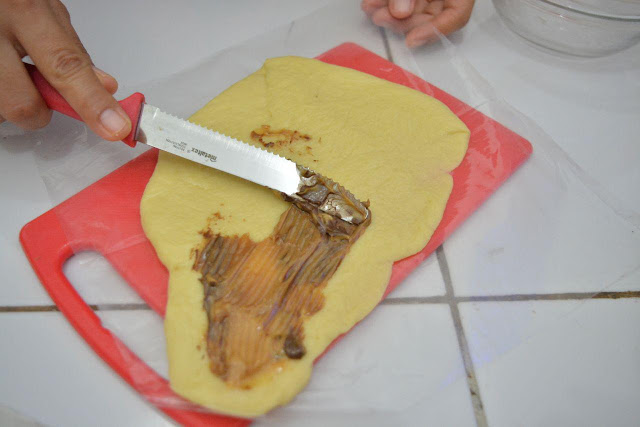 • Gulung adonan yang sudah diolesi Skippy Chocolate Peanut Butter.