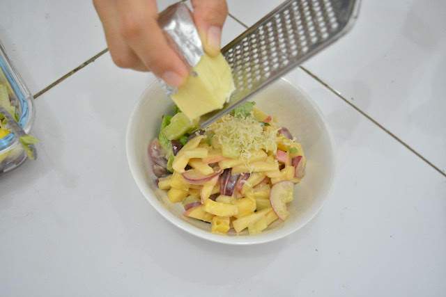 • Tuangkan dressing salad ke atas potongan buah dan selada. Campur hingga merata.