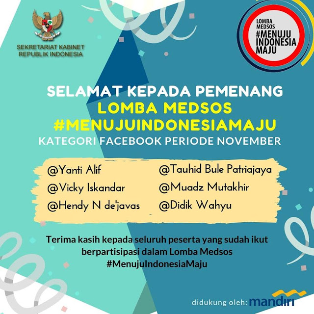 BTW, dalam rangka lebih memperkenalkan #MenujuIndonesiaMaju kepada masyarakat, Setkab RI menggelar beberapa kegiatan. Salah satu diantaranya adalah Lomba Media Sosial (Medsos) #MenujuIndonesiaMaju yang digelar sejak April sampai November 2018. Dalam pelaksanaan Lomba Medsos #MenujuIndonesiaMaju, Setkab RI tidak sendiri, melainkan juga menggandeng Bank Mandiri.