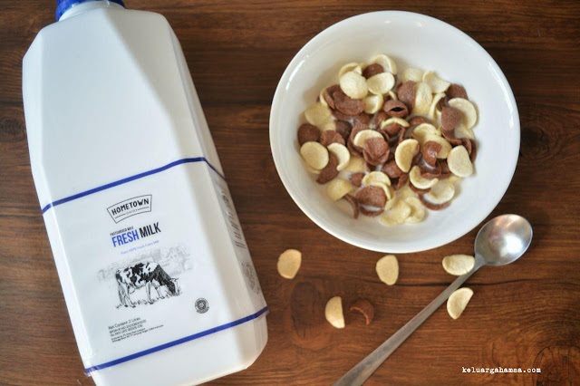 Kami sekeluarga sering sarapan sereal siram susu Hometown Dairy.