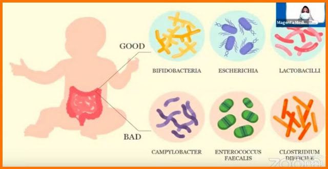 Dr. Molly pada kesempatan tersebut menjelaskan latar belakangnya, yakni bahwa 70-80% sel-sel imun sebenarnya terdapat dalam usus yang ada di saluran cerna. Nah, sebenarnya bayi sejak lahir tuh sudah memiliki imun alami untuk perlindungan tubuhnya, misalnya cairan dalam lambung, dll. Imun tersebut adalah mikrobiota baik yang melindungi anak dari hipersensitivitas seperti alergi serta memerangi mikrobiota patogen (mikrobiota buruk).
