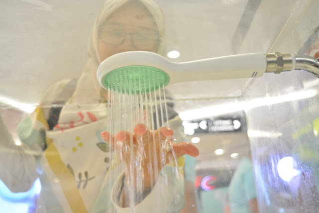 Nah benar kan. Kalau nyuci baju tuh sekalian biar hemat air. Eh showernya lucu ya mbak. Inovasi baru yang bikin hemat air. Save water!