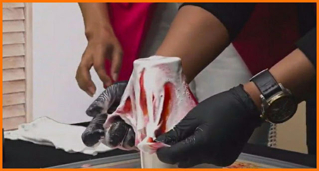 - Donna Agnesia menyiapkan baju yang sebelumnya diberi noda obat luka.