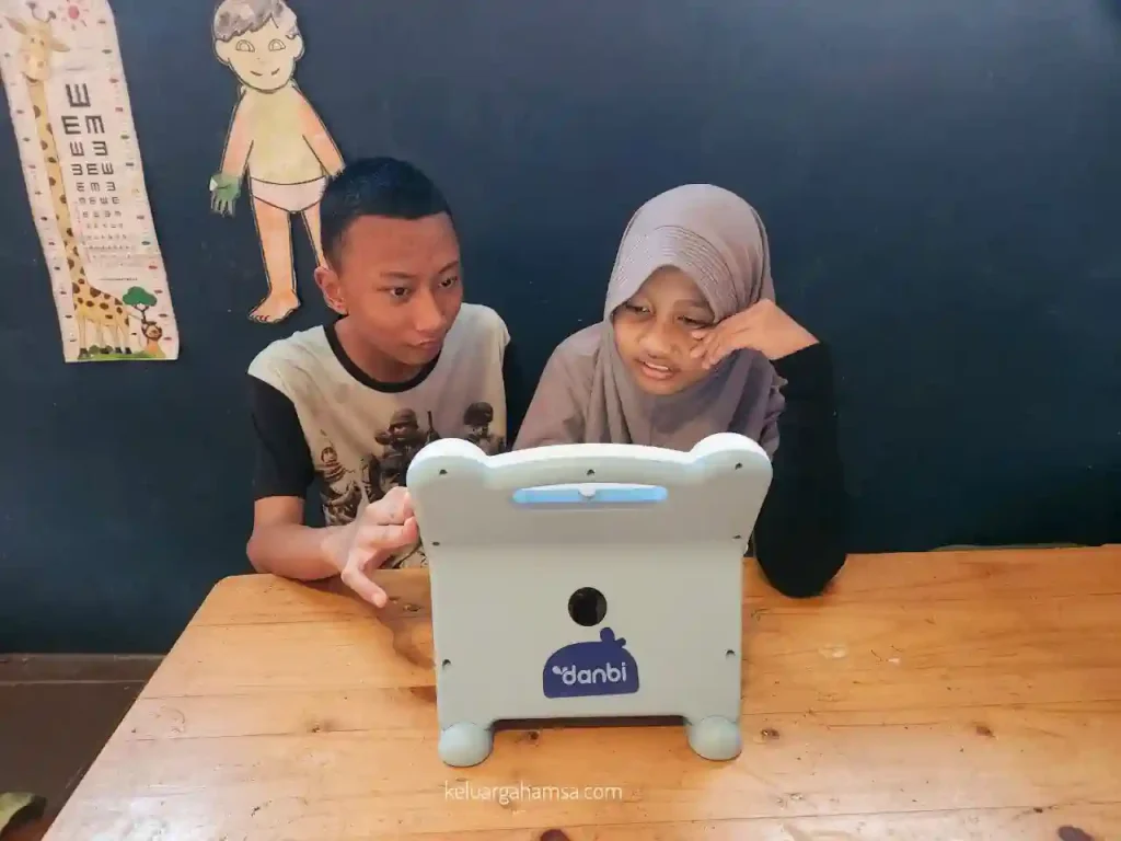 Mengenai perangkat khususnya, yang mirip tablet tadi, ini tuh bentuknya menyesuaikan dengan usia anak-anak yang mungkin agak ceroboh, kalau bawa-bawa sesuatu ya. Jadi, perangkatnya ini didesain tidak licin, kuat, dan tidak mudah pecah. Perangkat ini juga gampang digunakan sendiri oleh si kecil. Saya sering lihat anak-anak seumuran TK di sekolah anak-anak saya suka “memainkannya” sendiri.